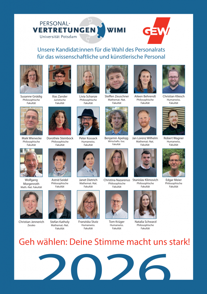 Gut zu wissen: Die Wahlen zum studentischen Personalrat der UP (übrigens der einzige StudPR außerhalb von Berlin!) finden nicht mit den anderen Personalratswahlen im April, sondern im Zeitraum vom 16. Juni bis 18. Juni 2026 statt, “parallel zu den Wahlen der studentischen Vertreterinnen und Vertreter in den Gremien der akademischen Selbstverwaltung.” (§ 94 Abs. 3 PersVG)