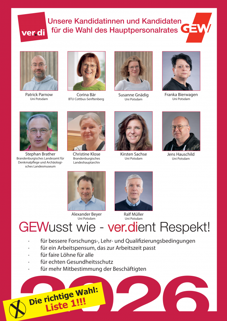 Die GEW wird an der Universität Potsdam mit einer offenen GEW-Liste (WiMi-PR) und einer gemeinsamen Gewerkschaftsliste mit ver.di (Gesamt- und Hauptpersonalrat) antreten. An der Brandenburgischen Technischen Universität Cottbus-Senftenberg gehen wir als GEW-offene Liste (Akademischer Personalrat) an den Start!
