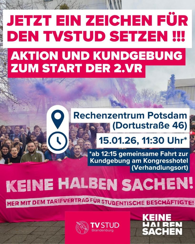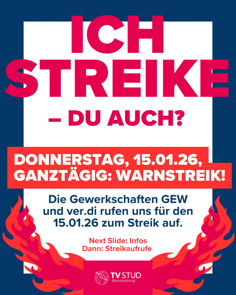 Wir sind die Initiative TVStud Brandenburg. Im Herbst 2023 haben wir das erste mal für bessere Arbeitsbedingungen und eine Tarifvertrag gestreikt. Im Ergebnis gab es leichte Verbesserungen und eine Verhandlungszusage für 2025. Die nächste Tarifrunde steht nun quasi vor der Tür. Das heißt: Wir streiken wieder für unsere Forderung für bessere Arbeitsbedingungen durch einen Tarifvertrag. Damit wir den TVStud — und einen guten Tarifabschluss noch dazu — zu bekommen, müssen wir im Oktober, November, Dezember Viele auf der Straße sein. Also gut, dass Du da bist!