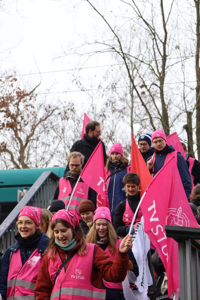 Wir sind die Initiative TVStud Brandenburg. Im Herbst 2023 haben wir das erste mal für bessere Arbeitsbedingungen und eine Tarifvertrag gestreikt. Im Ergebnis gab es leichte Verbesserungen und eine Verhandlungszusage für 2026. Die nächste Tarifrunde findet gerade statt. Das heißt: Wir streiken wieder für unsere Forderung für bessere Arbeitsbedingungen durch einen Tarifvertrag! Damit wir den TVStud — und einen guten Tarifabschluss noch dazu — zu bekommen, müssen wir im Januar und Februar Viele auf der Straße sein. Also gut, dass Du da bist!